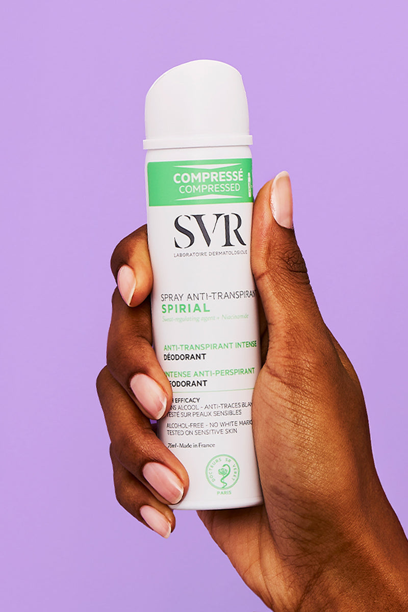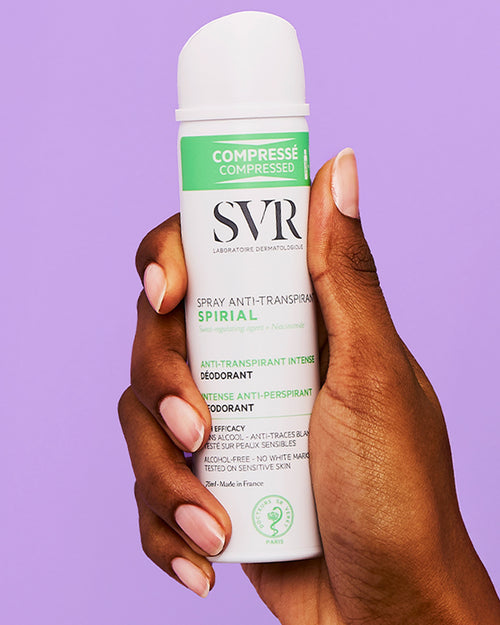 Spirial ist die Produktreihe für 48-Stunden-Deodorants und Antitranspirantprodukte von SVR. Die Pflegeprodukte sind speziell formuliert, um sich an die verschiedenen Arten des Schwitzens anzupassen: Formeln ohne Aluminiumsalze für normales Schwitzen und Formeln mit einer hohen Dosierung an Aluminiumsalzen für normales bis übermäßiges Schwitzen.